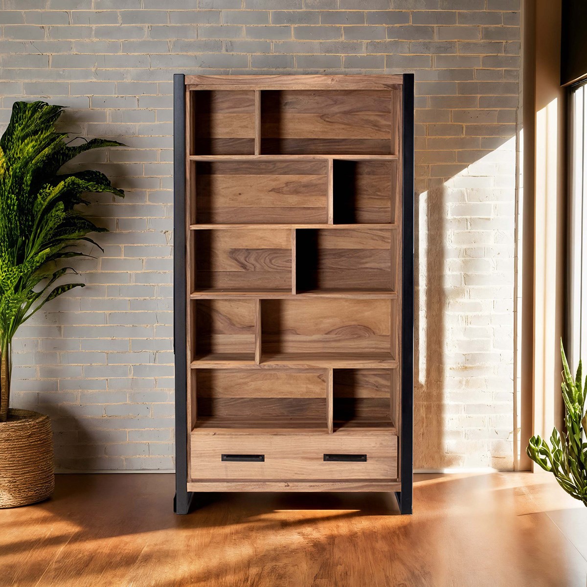 Voeg stijl en opbergruimte toe aan uw interieur met de Alfaro boekenkast. Gemaakt van massief hout, straalt ze warmte en stevigheid uit. Met 10 open vakken en 1 lade biedt deze kast volop ruimte om uw boeken, decoratieve objecten of persoonlijke herinneringen netjes te ordenen. Dankzij het slanke, verticale ontwerp past ze gemakkelijk in elke ruimte. De zwarte metalen poten geven de kast een elegante industriële uitstraling en zorgen voor extra stabiliteit. De Alfaro boekenkast combineert functionaliteit en design voor een perfect georganiseerde woonomgeving.