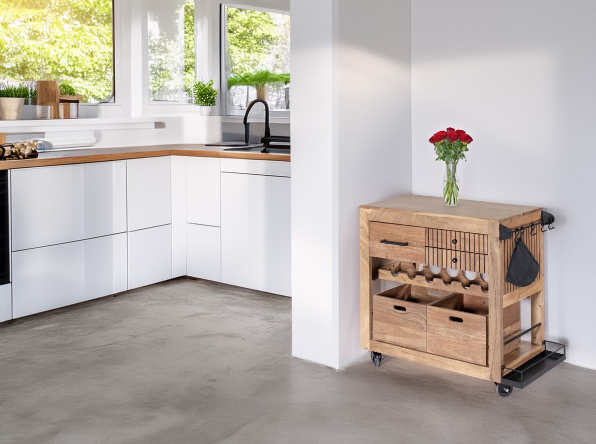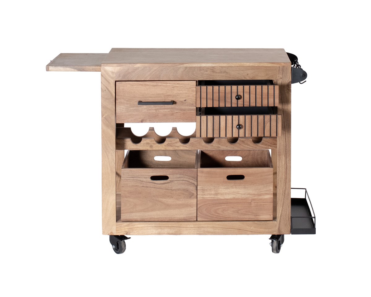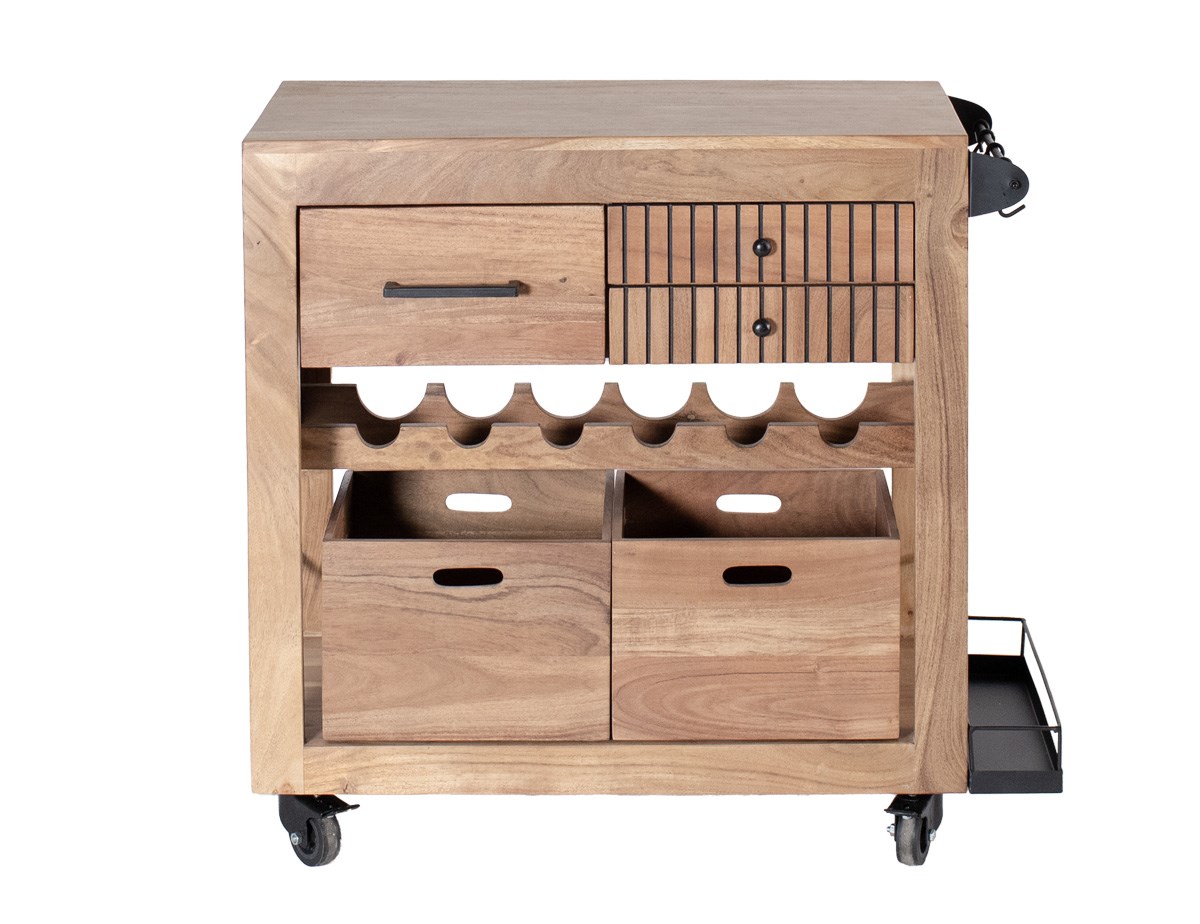 Het Bern dressoir van smoked acaciahout is praktisch en elegant. Het heeft 3 lades, een geïntegreerd flessenrek, 2 opbergbakken voor maximale organisatie en haken om je theedoeken aan op te hangen. Voor extra functionaliteit heeft het ook een kleine plank voor extra opbergruimte. Een functioneel en aantrekkelijk meubel voor je keuken of eetkamer.