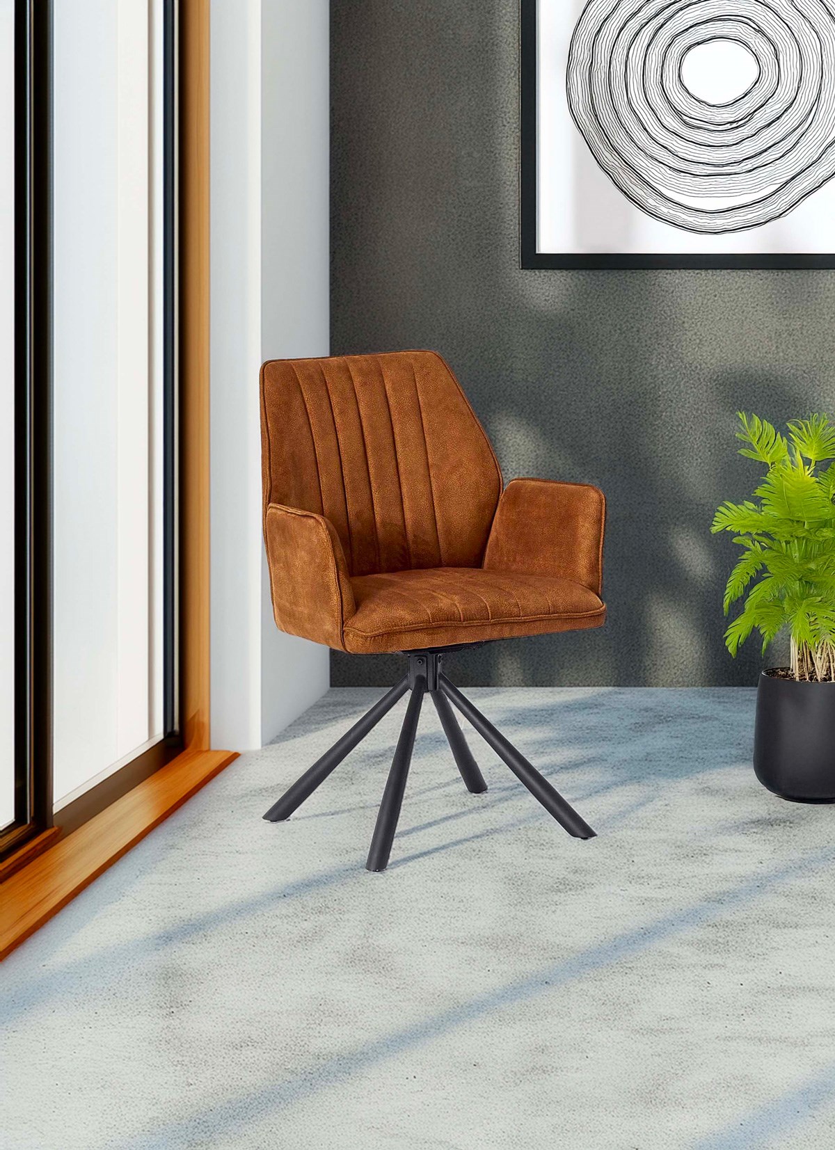 De draaistoel WAYNE in cognac heeft verticale naden op de zitting en rugleuning. Hij is comfortabel en heeft een eigentijdse stijl.