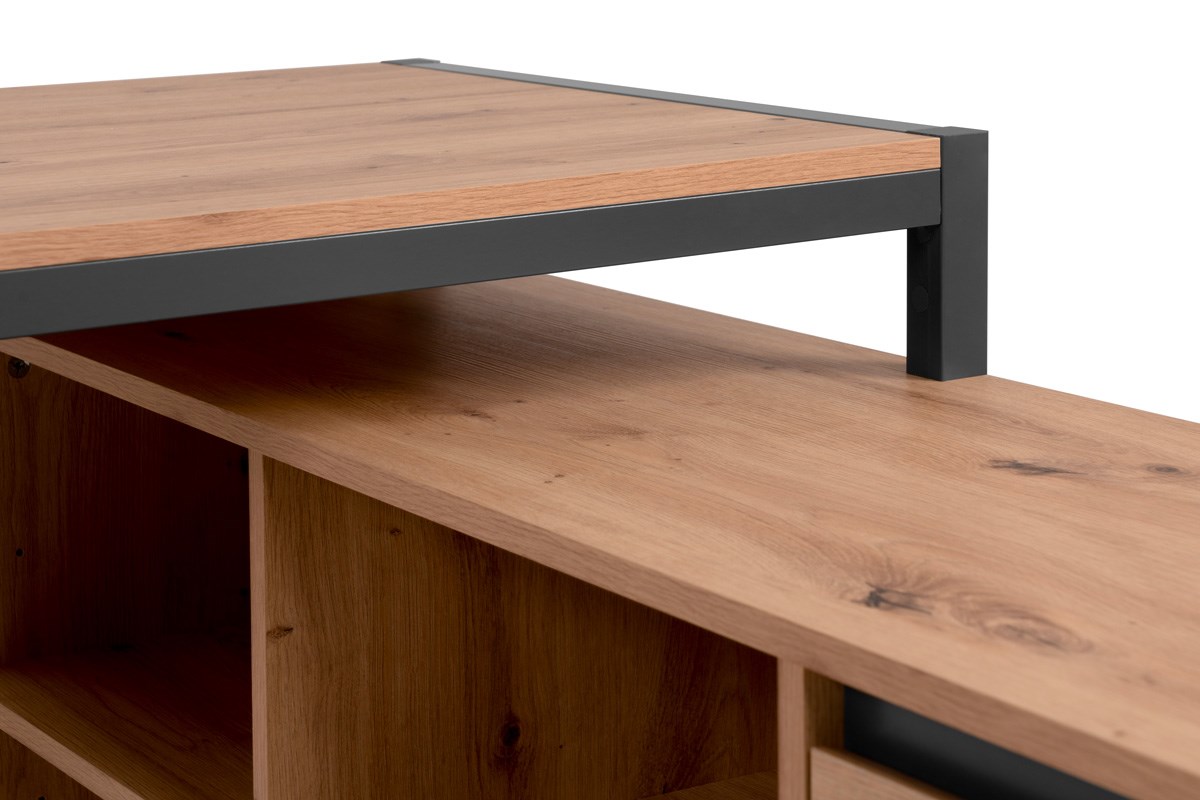 Deze hoekbureau DENVER wordt gekenmerkt door een industrieel karakter. Het bureau is gerealiseerd in eik decor gecombineerd met antraciet kleur. Dankzij z'n 4 nissen, 1 lade et 1 deur beschik je over voldoende opbergruimte.Geef dit leuk meubel een gezellige uitstraling door er een lamp, plant en bureauaccessoires op te plaatsen.