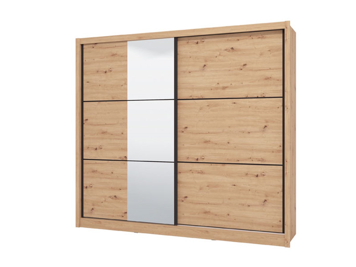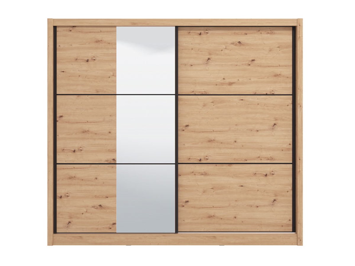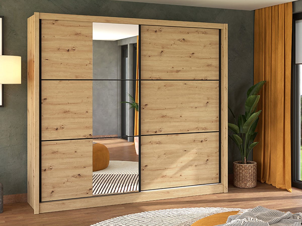 Breng stijl en functionaliteit in je slaapkamer met de NAVARA 242 cm schuifwandkast. Met zijn eigentijdse design in ambachtelijk eiken decor en geïntegreerde spiegel op de helft van een van de deuren, combineert hij natuurlijke elegantie met alledaags praktisch nut. Deze kast is perfect om ruimtes visueel te vergroten en licht te weerkaatsen en past harmonieus in elk interieur.
