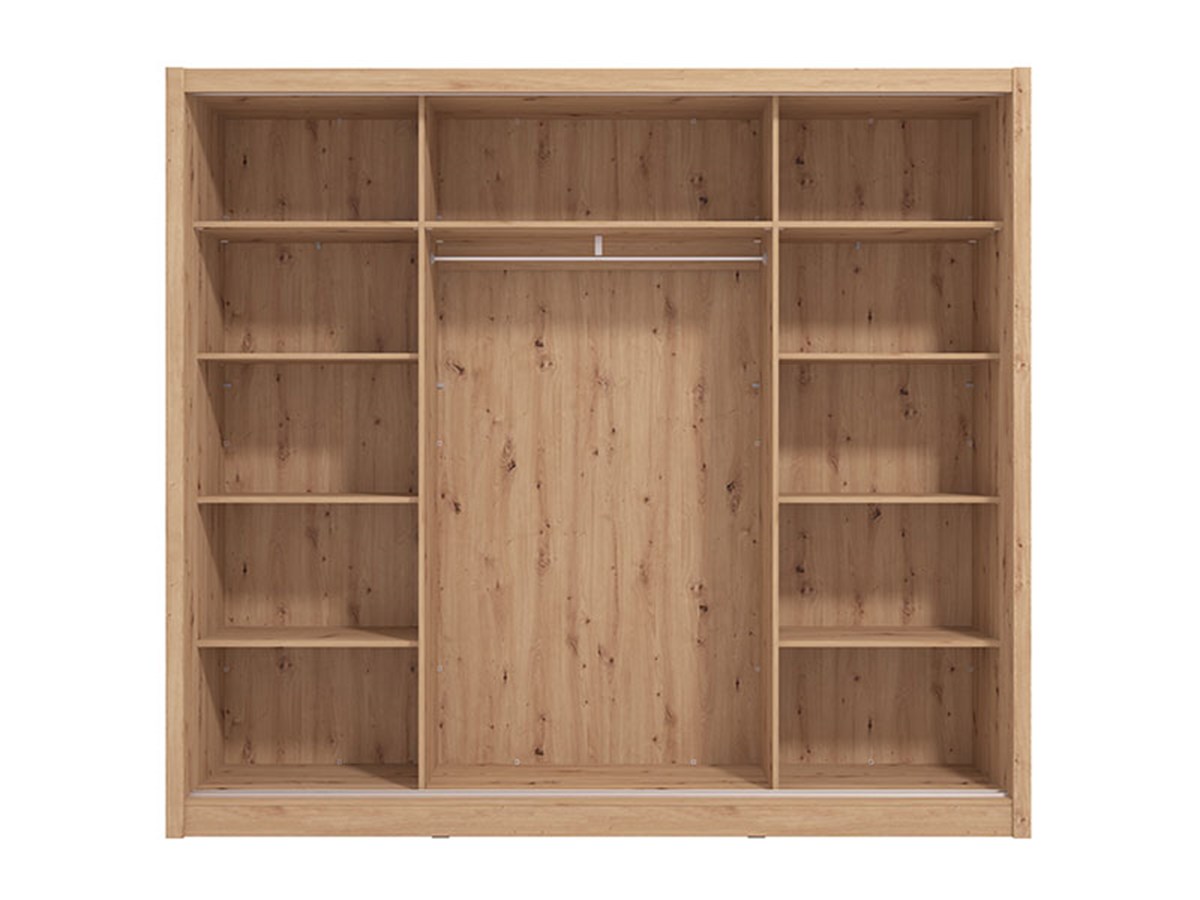 De royale breedte van 242 cm biedt optimale opbergcapaciteit, terwijl het vloeroppervlak onder controle blijft dankzij de schuifdeuren. Binnenin vind je een doordachte organisatie: 11 nissen voor je opgevouwen kleding, accessoires of beddengoed, plus een ruime kledingrek om je outfits op te hangen en kreukvrij te houden.