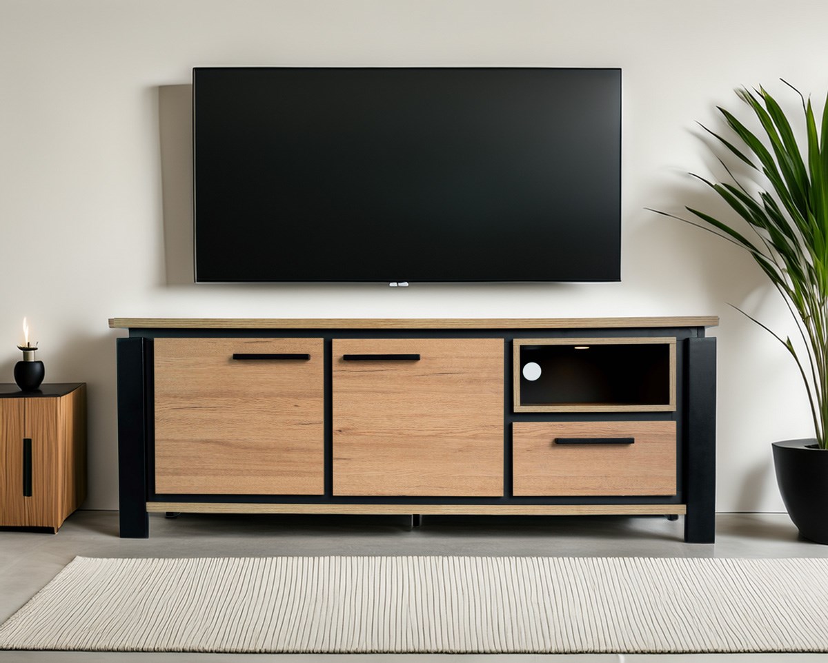 Ontdek het TV meubel BUCKLEY (160 cm) – een perfecte combinatie van houtdecor en zwart metaal voor een moderne, industriële uitstraling. Dit televisiemeubel is niet alleen stijlvol, maar ook praktisch met 2 deuren, 1 lade en 1 open vak voor voldoende opbergruimte. De sfeervolle lichtverlichting accentueert het open vak, waardoor dit meubelstuk een echte blikvanger is in je interieur. Perfect voor je woonkamer of hal! Voeg een stukje stijl en functionaliteit toe aan je huis met BUCKLEY.