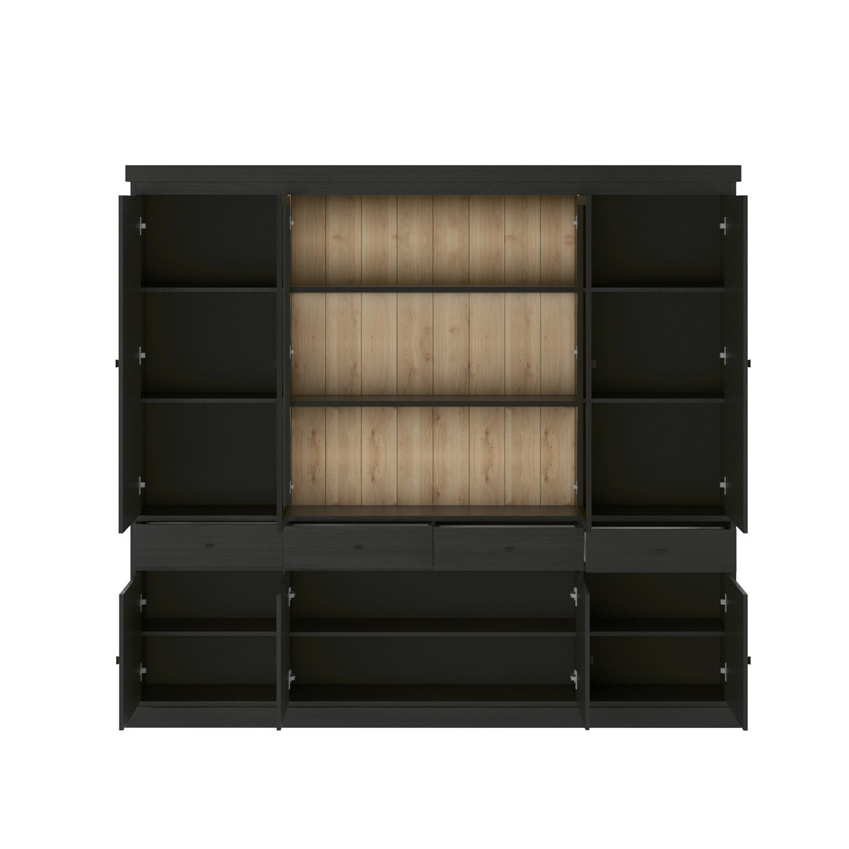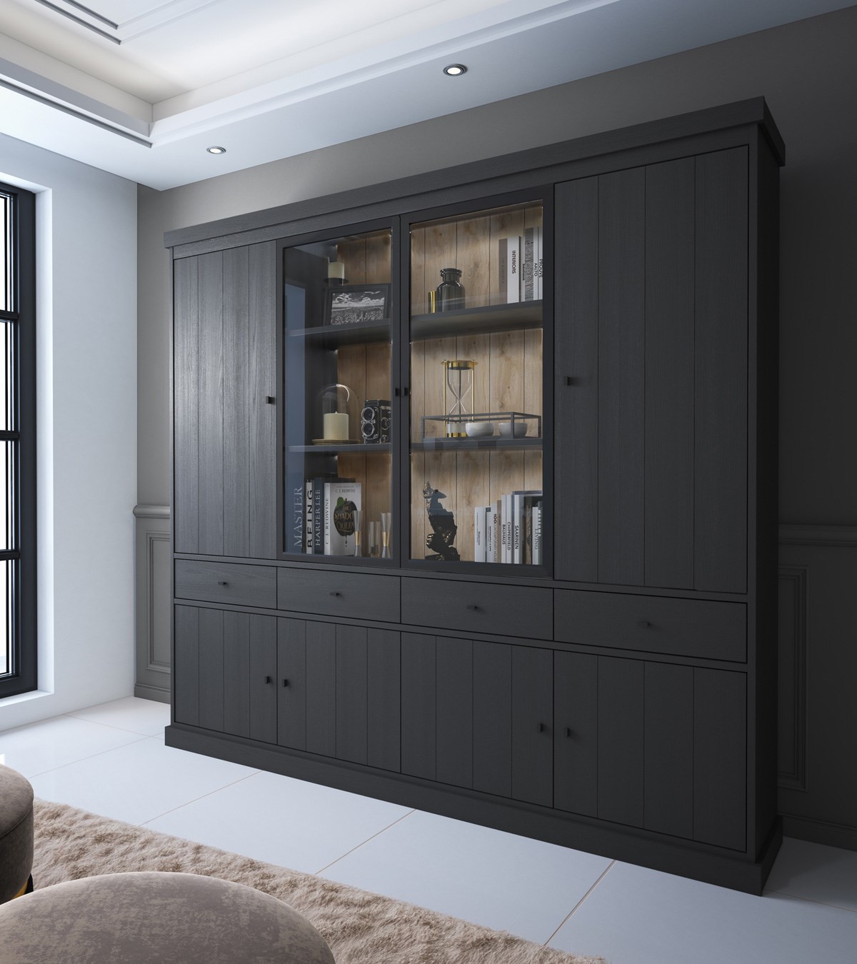 Ontdek de elegantie van de 240 cm lange VALENCIA vitrinekast, gemaakt van melamine van gerookt black oak van hoge kwaliteit. De discrete zinken handgrepen voegen een modern tintje toe aan het tijdloze ontwerp. Perfect voor het uitstallen van al je favoriete items en het toevoegen van karakter aan je huis. Bestel de Valencia vitrinekast vandaag nog en geef je huis een luxe uitstraling.