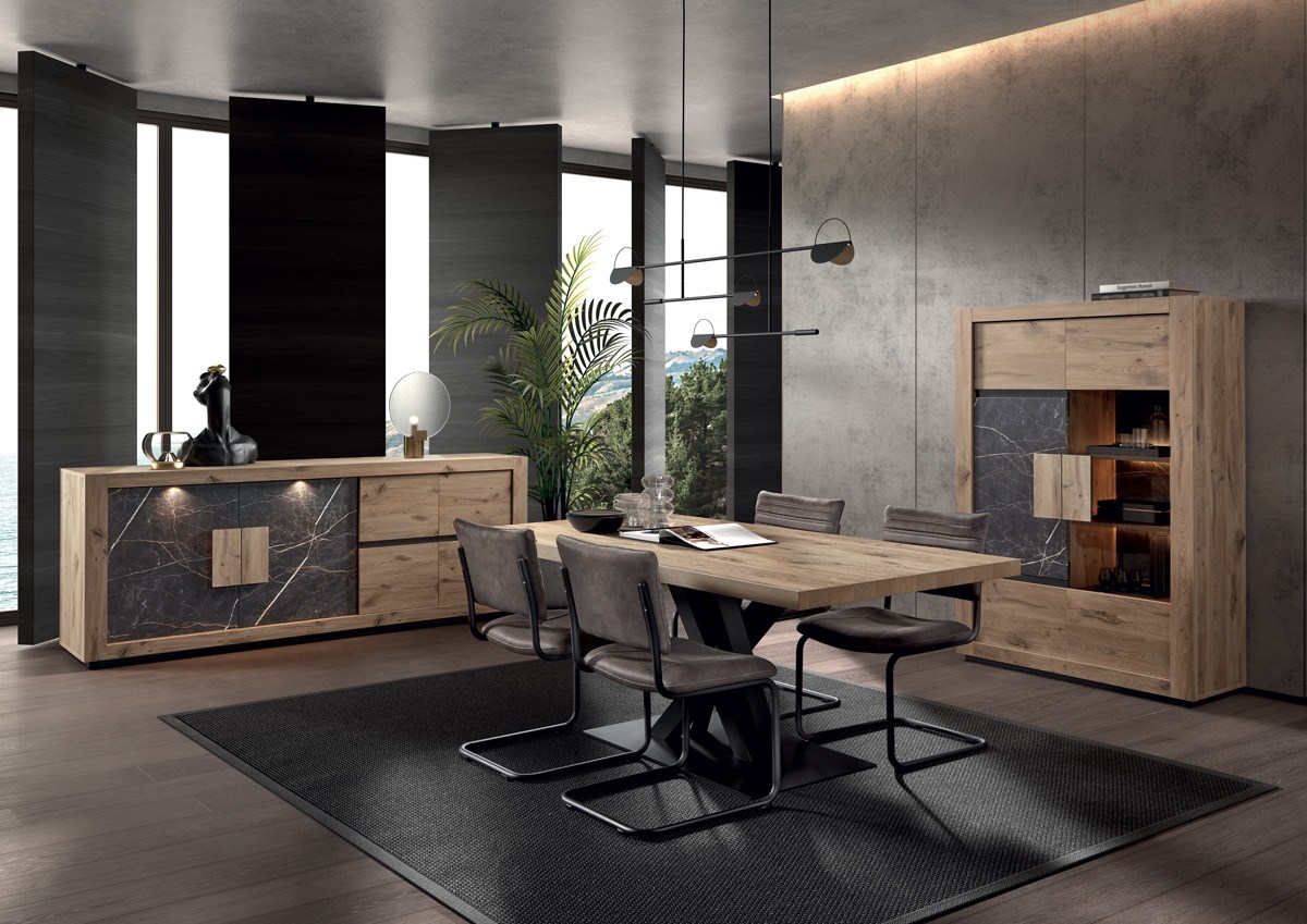 De prachtige woonkamer uit de SACHA collectie brengt elegant design in je kamer. Ze is afgewerkt in canyon eiken en marmer. De dressoir heeft 4 draaideuren. Grote planken achter de deuren geven je veel opbergruimte. Je kunt ook je decoratieve items op de bovenste plank zetten. De vitrine heeft 2 draaideuren 8 grote planken achter de deuren geven je veel opbergruimte. LED inbegrepen.
